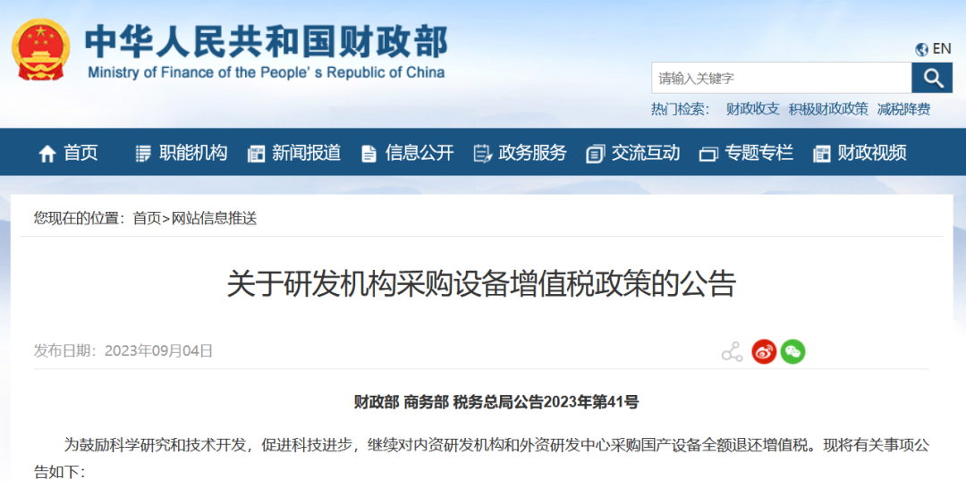 為鼓勵科學研究和技術開發,促進科技進步。近日,財政部、商務部、稅務總局三部門(mén)共同(tóng)發布(bù)繼續對內資研發(fā)機構和外(wài)資研發中心采購國產設備(bèi)全額(é)退還增(zēng)值稅相關政策,此政策延續至(zhì)2027年12月31日。研發機構采購國產設備享受全額退還增值稅,可以有效(xiào)降低(dī)科研機構設(shè)備的(de)采購成本,提高項目資金的使用效率。