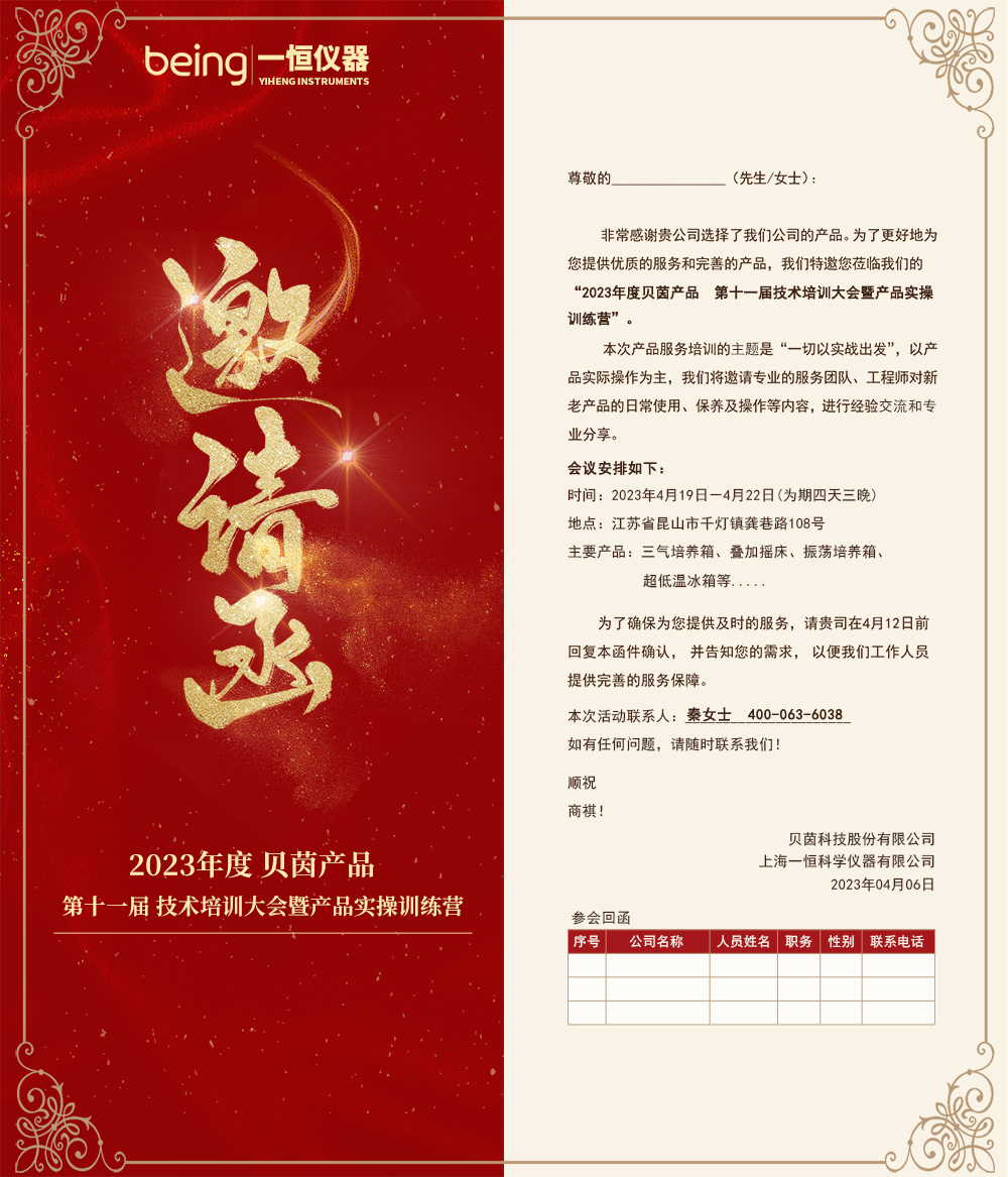 2023-04-11 | 文章來源: | 點擊率(lǜ): 誠邀您參加2023年度貝茵產品(pǐn)第十一屆技術培訓大會暨產品實操訓(xùn)練營尊敬的合作夥伴: