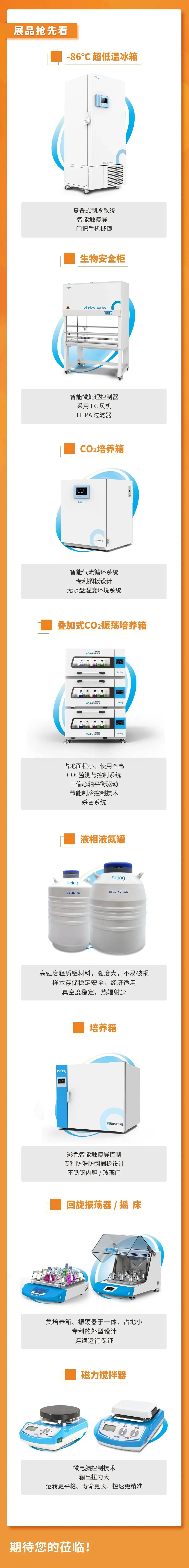 我們本次展會將攜-86℃超低溫冰箱、生(shēng)物安(ān)全櫃、二氧化碳培養箱、疊加式二氧化碳振蕩培養箱、液相液氮罐、搖床、磁力攪拌器等產品(pǐn)亮相(xiàng)於B018展台,期待(dài)您蒞臨現場,交流合作。