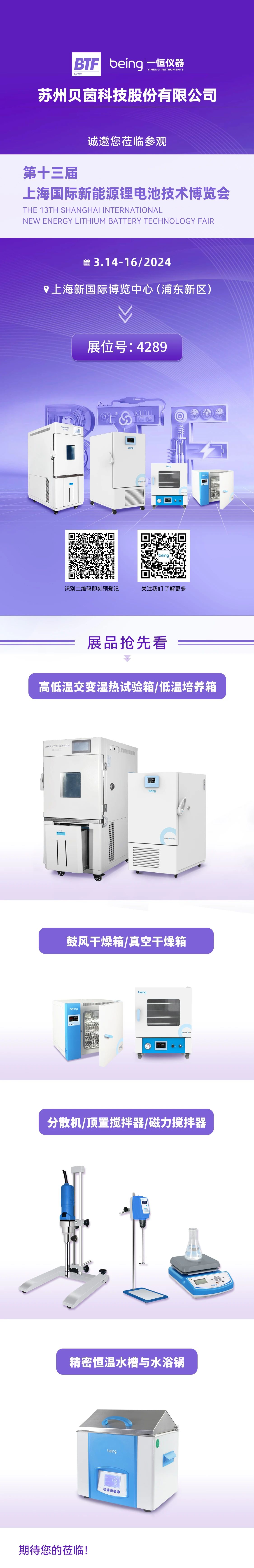 2024-03-11 | 文章來(lái)源: | 點擊率: BTF2024第十三屆上海國際新能源鋰電池技術展覽會將於3月14日至16日在上海新國際(jì)博覽(lǎn)中心舉辦,展品涵蓋動力電池、儲能電池電芯、PACK、正負(fù)極材料(liào)、電(diàn)解液、隔膜及(jí)配套材料、電池裝備等。本次展覽會,貝茵科技將在(zài)E4館4289號展位,現場展示(shì)高低溫(交變(biàn))濕熱試驗箱,低溫培養箱,真空幹燥箱,粘度計,磁力攪拌器等儀器設備。期待您蒞臨現場,參觀指導(dǎo),交流合作!